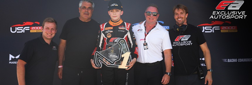 KERSHAW, S.C. – Exclusive Autosport’s USF Juniors squad faced a demanding tripleheader for Rounds 4, 5 and 6 this past weekend at the 2.279-mile, 14-turn Carolina Motorsports Park in Kershaw, South Carolina. The team fielded cars for four drivers on the first rung of the USF Pro Championships Presented by Continental Tire, and it was rookie Cole Mederios who carried the EA flag to the podium in all three races. The Canadian won the opening 15-lap race and then finished second in Race 2 before a penalty ultimately dropped him to ninth. Cole fought back on Sunday with a third-place run to move him up to fifth in the championship standings. Three additional top-10 finishes were gained by Bex Cranston, Brenden Cooley and Connor Aspley, and there were more for the taking if it were not for contact and damage that were not ultimately their responsibility.